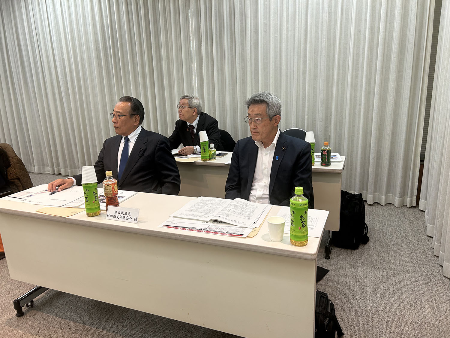 令和8年度国の施策・予算に関する提案・要望意見交換会 2025年11月21日 最終更新日時 : 2025年11月21日 自民党 秋田県支部連合会 11月19日東京において秋田県による「令和8年度国の施策・予算に関する提案・要望に係る意見交換会」が開催され、鈴木知事から人口減少の抑制、クマ被害対策、農林水産業の安定、洋上風力発電などの要望がありました。 秋田県連からは県連会長御法川信英衆議院議員、冨樫博之衆議院議員、石井浩郎参議院議員、進藤金日子参議院議員、福原淳嗣衆議院議員が出席し秋田の未来づくりに向けた意見交換が行われました。 また、県議会議員の工藤嘉範議長、加藤鉱一県連副会長、北林丈正幹事長、杉本俊比古総務会長が出席しました。 FacebookXBluesky